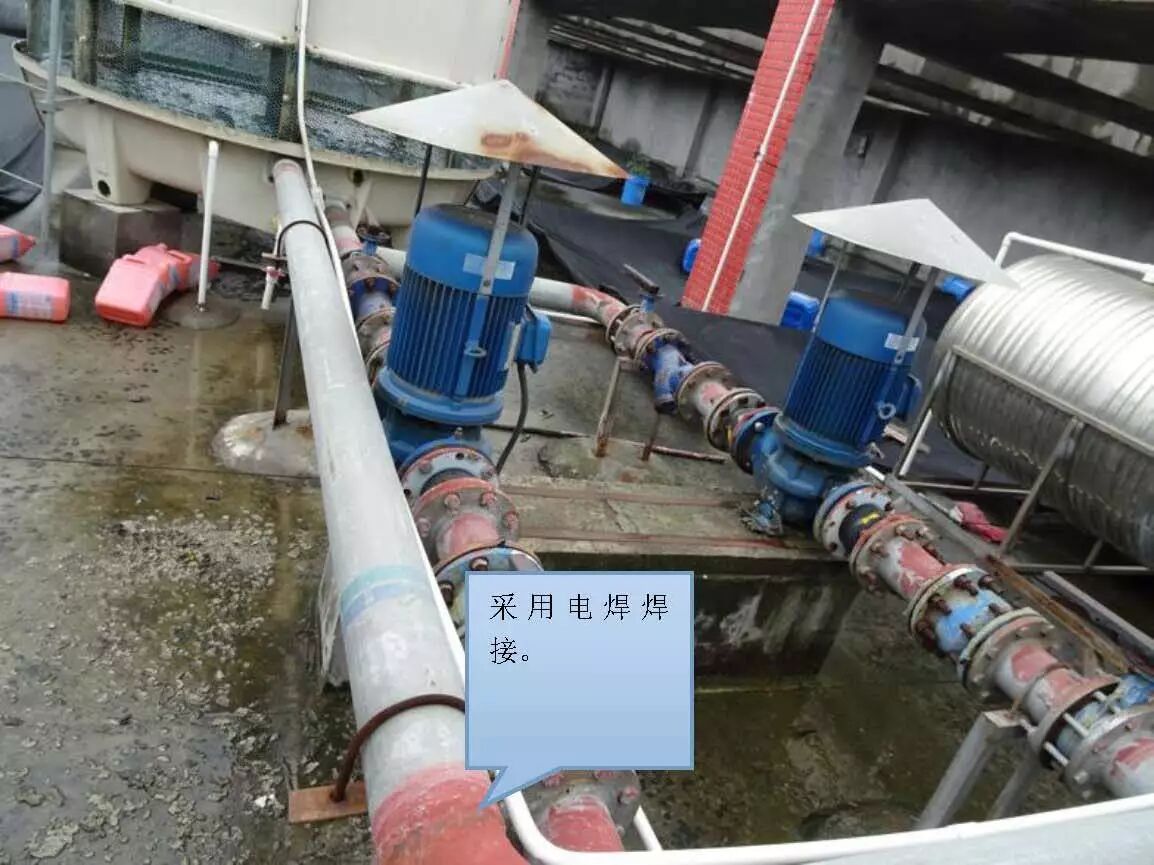 經現場勘察該空調安裝工程的室外冷卻塔多處管道鍍鋅管和防腐涂層的鋼管采用的是焊接。